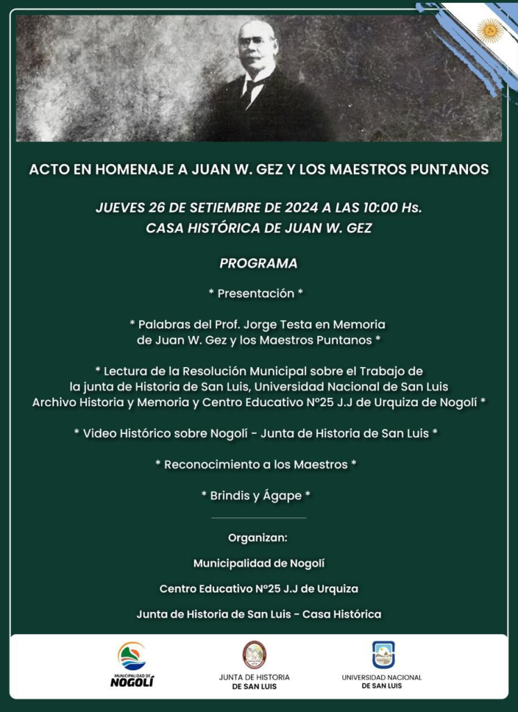 El pasado 26 de Setiembre la Junta de Historia de San Luis organizó el acto conmemorativo del 159 Aniversario del Natalicio de Juan Wenceslao Gez y el homenaje a los Maestros Puntanos. En un emotivo acto que se inició en la Escuela Justo José de Urquiza y continuó en la casa histórica donde el Profesor Gez vivió y desarrolló parte de su obras literarias.