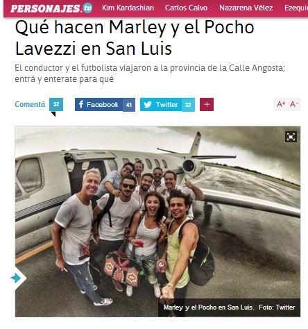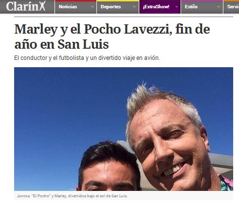 Tanto Clarín como La Nación se hicieron eco de la presencia del conductor y el delantero de la selección Argentina.”Grabando con @PochoLavezzi un especial de vacaciones en San Luis que saldrá el 10 de enero por Telefe”, escribió Marley. Los dos medios se interesaron de las visitas. Enterate que dijeron Clarín y La Nación.