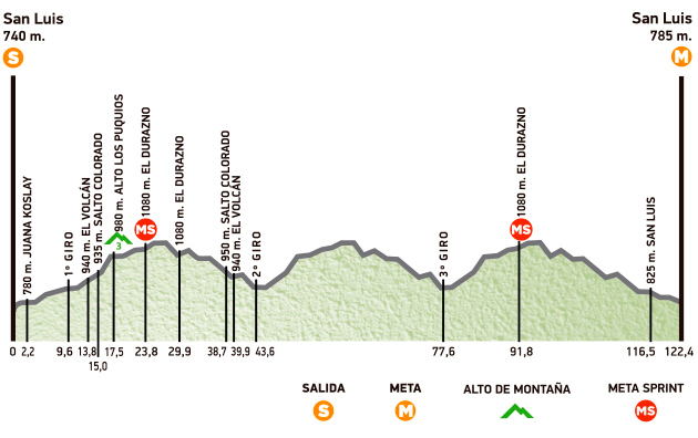 La llamada “etapa del campeón” comenzará en el Puente Derivador, a las 15:30, y se dirigirá rumbo a Juana Koslay, pasará por El Volcán y llegará al alto de Los Puquios, donde se realizará la ultima meta de montaña de la competencia, transcurridos 17,5 km.